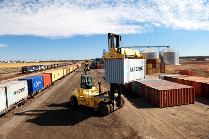 Train unloading and reloading is carried out efficiently by two heavy Hyster forklifts, one Hyster reach stacker, and one 16 tonne Toyota container handler.